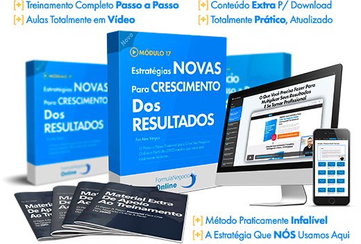 Novas Estratégias: Entrando para o Fórmula Negócio Online você vai ter acesso a todas as novas estratégias e tendencias do marketing digital (Só para você ter uma ideia foram feitas agora em agora em Março de 2020, 24 NOVAS melhorias, atualizações e inclusões);